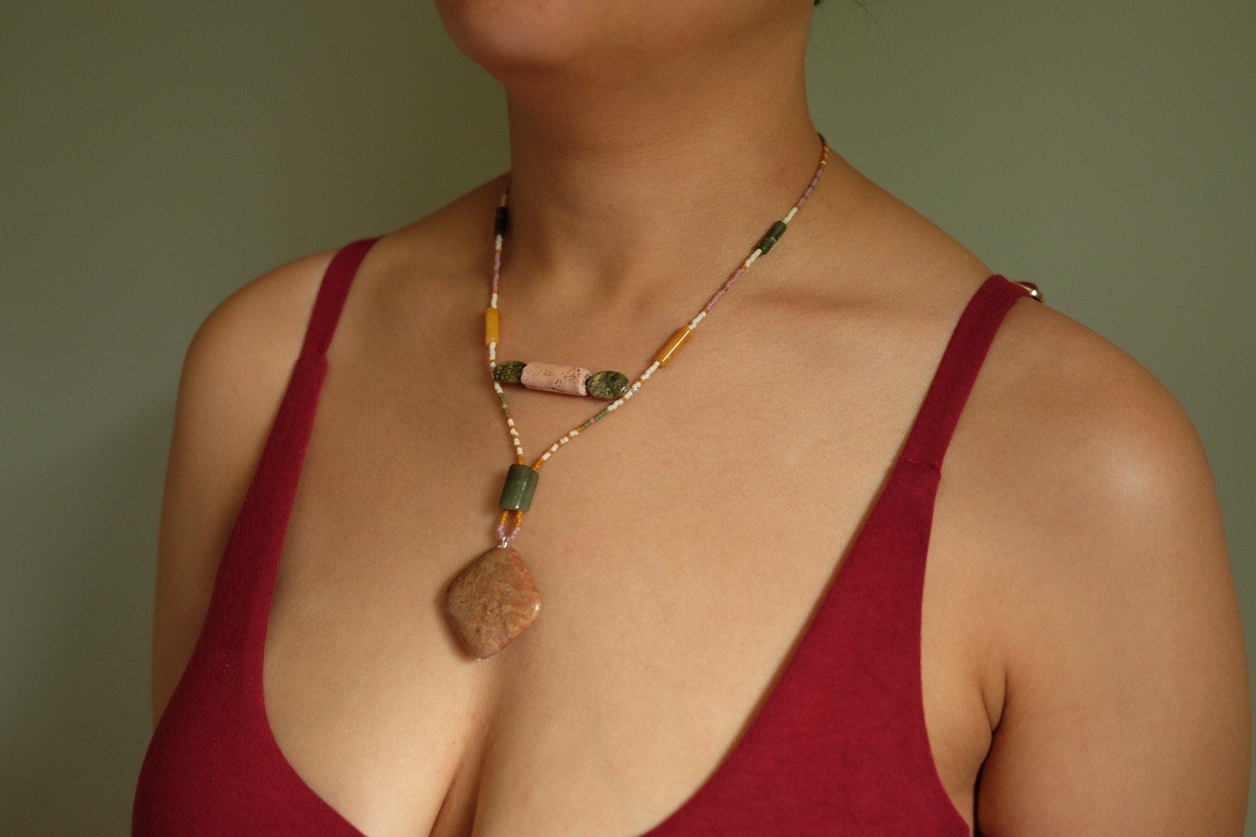 Handmade necklace using Jasperite, green + yellow jasper, unakite, clay & miyuki glass beads with sterling silver clasp.
