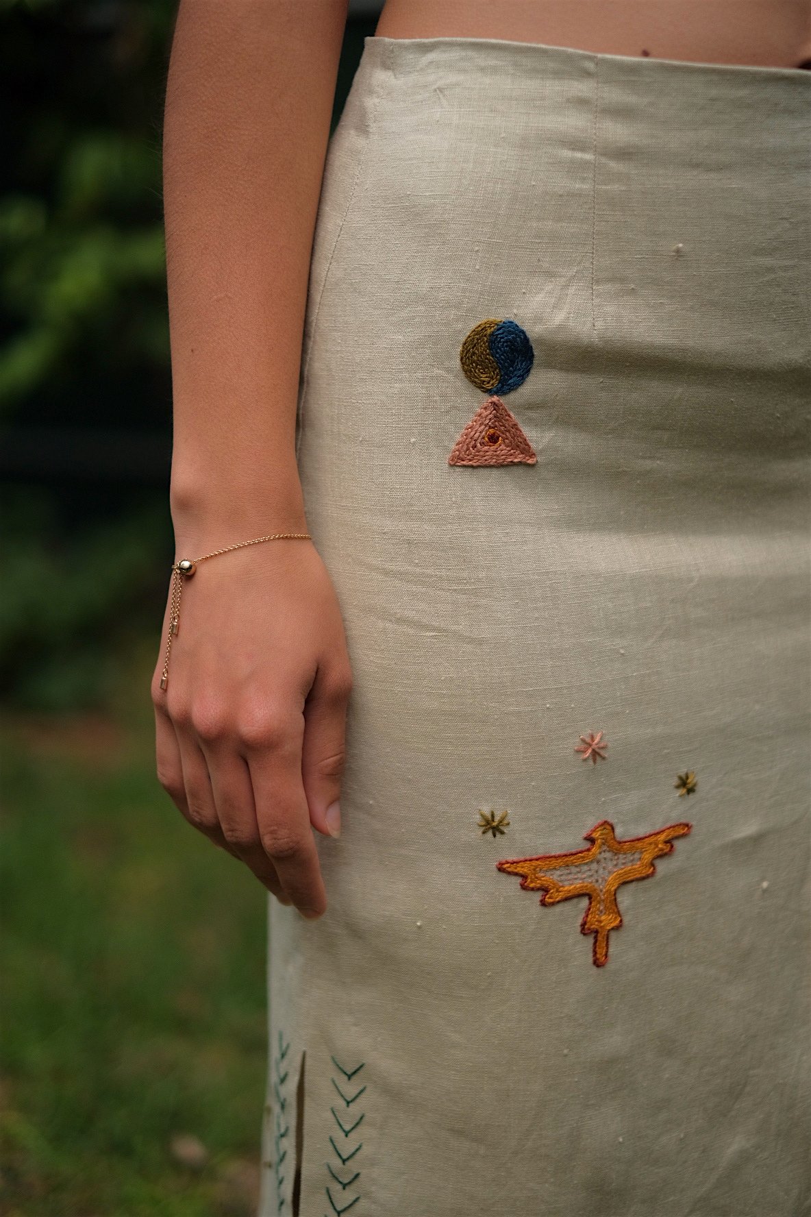 This is a unique 'one off' piece created as an art piece you wear. Embroidered over several months on and off during the makers (Nadia Suartika's) maternity leave and first year as a parent. Nadia’s creative process with embroidery is different each time. Sometimes beginning with a plan, rough vibe or by just starting somewhere on the piece and letting it organically flow and manifest depending on the inspiration. This piece was much like the latter.